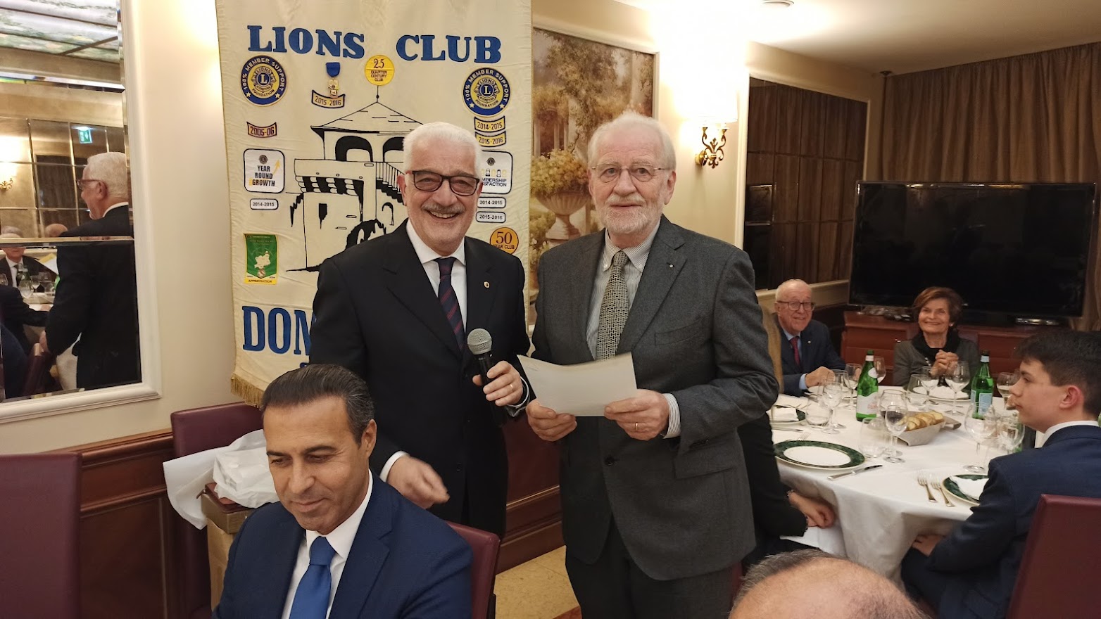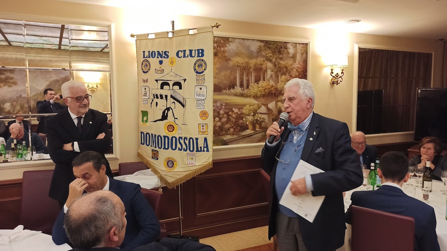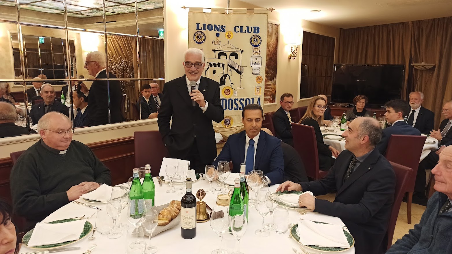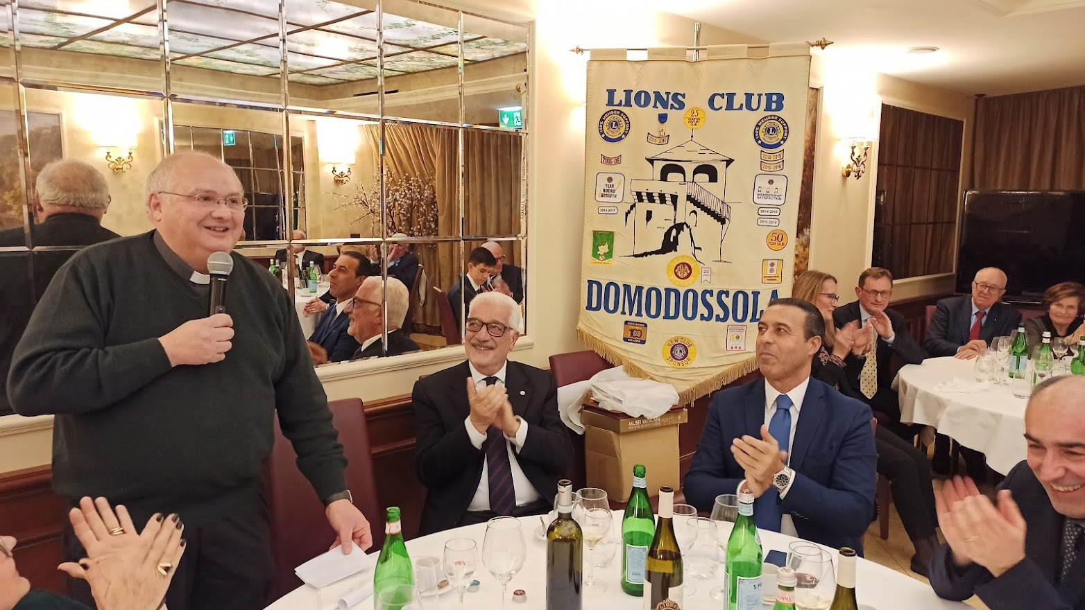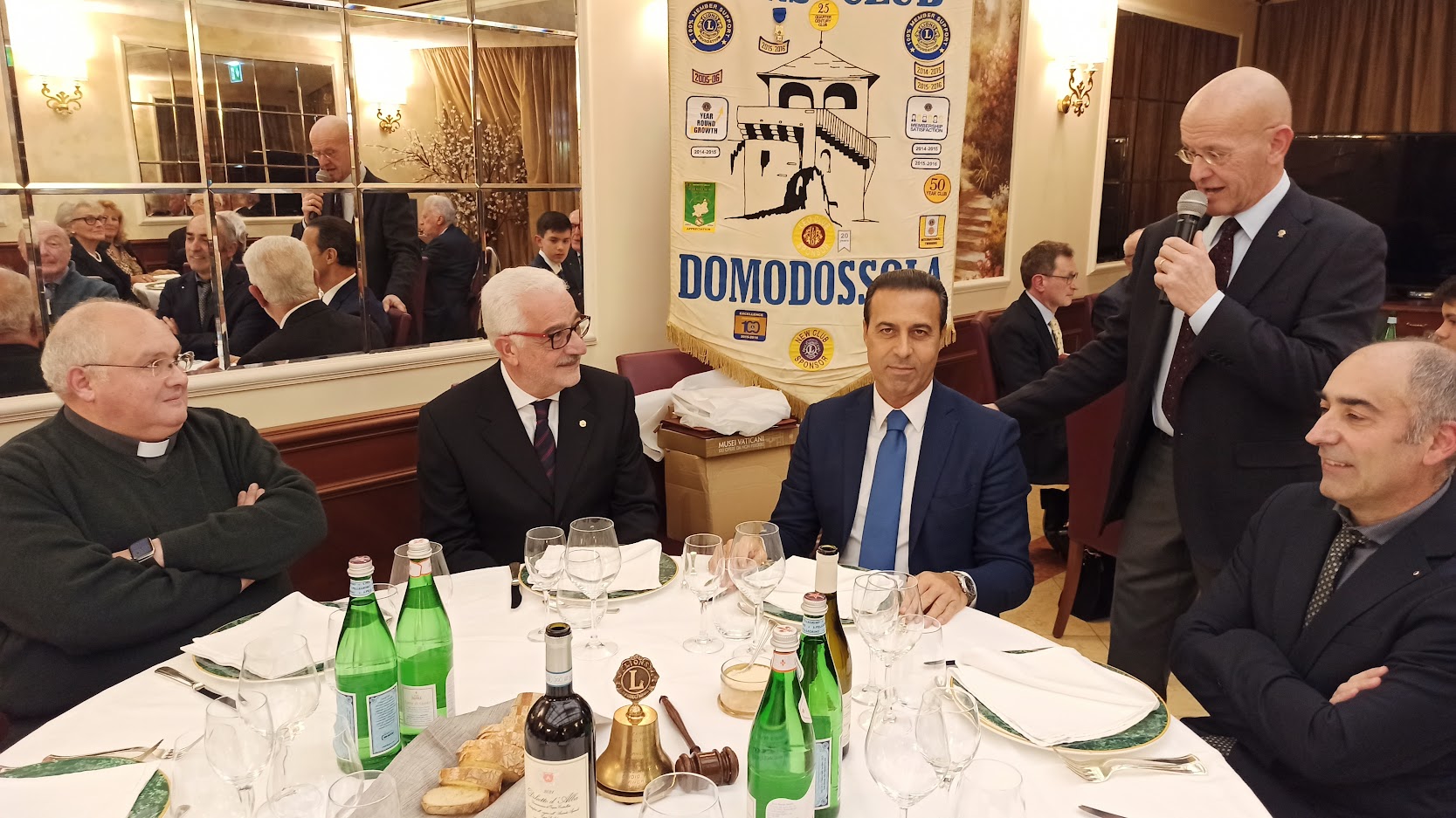 Il titolo della serata “Don Camillo e Peppone, nel segno della tradizione” ci porta ad un altro dei meeting ormai diventati abituali per il Club. Fatta la doverosa presentazione degli ospiti da parte del cerimoniere Enrico Verdi, prende la parola il Presidente per l’usuale saluto ai presenti. Butti nel salutare Don Vincenzo Barone, Parroco di Domodossola, si sofferma sulla data del suo arrivo nella nostra città 2012 …. Sono ormai trascorsi dieci anni; è una data da festeggiare …;  doveroso saluto anche all’altro nostro ospite Lucio Pizzi sindaco di Domodossola ormai al secondo mandato. Vengono consegnati gli attestati e le spille per il riconoscimento dell’anzianità Lionistica ai soci Crugnola per i suoi 35 anni e a Grossi per i suoi 30 anni di presenza nel Club. Dopo la cena, gli ospiti sono invitati dal Presidente al racconto della loro esperienza passata, presente ed ai programmi futuri. Prima di cedere la parola a Don Vincenzo il nostro sommo Vate Antonio Pagani declama dei versi da lui composti in onore del decennale dal titolo “Sembra ieri”. Visibilmente commosso per i festeggiamenti, il Parroco ci racconta dei sui dieci anni a Domodossola che definisce “belli, intensi e con una popolazione vicina e partecipe”. Si è accorto di questo amore “a prima vista” anche il Vescovo che definisce Domodossola “una Diocesi nella Diocesi”. Don Vincenzo ci dice che per lui “la speranza è alla base della ripartenza”. Quasi il 32% delle famiglie ha un reddito inferiore ai € 10.000, con la nostra area maggiormente in difficoltà rispetto alle altre della regione. La distribuzione della borsa viveri da parte delle Caritas è aumentata del 20% e con il pagamento di bollette ed affitti raggiunge la cifra di € 65.000 donati alla comunità. Si sta creando una fascia di nuovi poveri. Riguarda coloro che sono di poco superiori alla fascia di reddito minimo che riceve aiuti economici dallo stato, “silenziosi” ma stritolati dalla nuova situazione economica. Nel focalizzare l’attenzione per scoraggiare coloro che, spacciandosi per bisognosi, approfittano di tutti i punti di aiuto messi a disposizione per accaparrare più risorse possibili, Don Vincenzo ribadisce il suo ringraziamento alla comunità per il grande impegno verso gli indigenti. Termina il suo intervento ricordando che le problematiche dei giovani non sono terminate. La fascia di età dei ragazzi delle scuole superiori è quella più a soggetta a rischi e stimola tutti a mantenere un occhio vigile sulle difficoltà della gioventù. Ringraziandolo per il suo intervento Butti comunica che è in fase di studio e attuazione un service, condiviso con tutti i Club di servizio della zona che farà capo alla Fondazione Comunitaria VCO, per un importo di € 40.000 da destinare all’assistenza dei più bisognosi. Viene, quindi, data la parola al Sindaco che ringraziando dell’invito ci indica anche le nuove emergenze che sono nate a seguito della pandemia per il COVID 19.